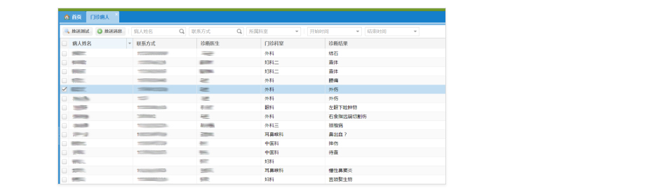 查看详细的门诊信息,可根据指定的条件,搜索相关的病人,下发短信。